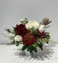 A mix of designer’s choice white blooms to include premium stems of Ranunculus, Peony, Dahlia, Anemone or other seasonal thrillers. Mixed with Lisianthus, Mum, Rose, Alstroemeria, Hydrangea nestled in assorted greens and Eucalyptus. We’ll stack this arrangement with several stems of premium seasonal blooms and some denser fillers. Can create a dramatic full large centerpiece style arrangement to fill a dining table or in a taller vase that’s perfect for a kitchen island or entry console. Wrapped in kraft paper and tied with silk ribbon.