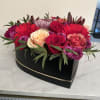 This romantic heart-shaped floral box arrangement features a beautiful blend of soft blush and peach blooms, including roses, chrysanthemums, and delicate seasonal accent flowers. Designed in a sleek keepsake box, this elegant arrangement showcases gentle pastel tones that symbolize love, affection, and heartfelt sentiment.