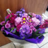 A nice a pretty bouquet with different shape of purple like purple daisies, carnations, some roses, purple stock, purple astromelias, purple Stacie with some green leaves, these beautiful flowers wrapped with black and purple paper with beautiful purple bow.