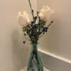 Two beautiful roses arranged with fresh greenery in a petite vase. This sweet and simple design is perfect for a small gesture, a desk arrangement, or sending a little love just because.