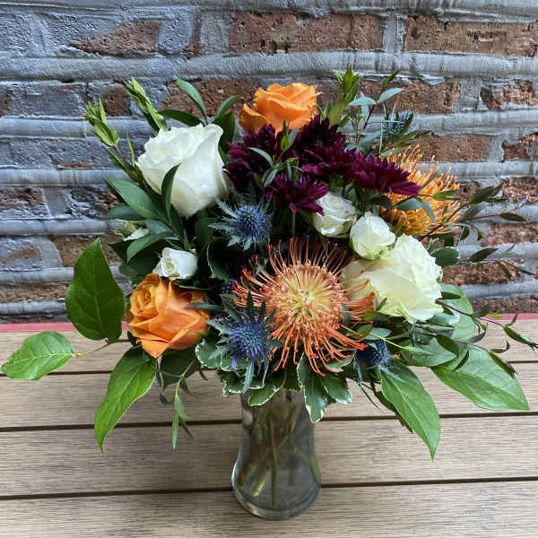 beautiful bouquet hand delivered. Lots of beautiful, fresh blooms with vibrant fall colors. Love the option of no vase. Highly recommend for all your floral needs