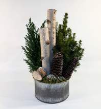 An elegant and festive planting of white amaryllis accented with white branches, golden pine cones and baubles. Finished with snowy moss in a gold compote vessel.