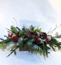 Our signature 2025 textural centerpiece designed with evergreen sprigs, magnolia leaves, red roses, burgundy baubles and other wintery elements placed in a rustic rectangular wooden box.
