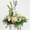 A breathtaking all-white masterpiece that combines texture and height to create a focal point of quiet reflection. Soft white Hydrangeas and delicate Alstroemeria provide a cloud-like base for the elegant Madonna centerpiece, while architectural Snapdragons draw the eye upward. Perfectly balanced with fresh greenery and airy accents, this arrangement is a sophisticated choice for services, anniversaries, or religious milestones.