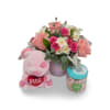 Blush Kiss Bundle is the perfect Valentine’s gift set, pairing our sweet Blush Kiss floral arrangement with a cuddly kiss-themed plush pig and a jar of pink piglet gummies.