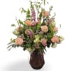 Peach roses and pink larkspur rise above clusters of white viburnum and soft carnations in an airy, asymmetrical Mother's Day arrangement that feels both romantic and effortlessly fresh. This flower arrangement for Mother's Day, anniversaries, birthdays, get well wishes, or a just-because surprise uses springlike peach, pink, yellow, purple, green, and white tones to make the person you're thinking of feel truly celebrated.