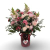 Happily Ever After is a romantic, garden-style arrangement filled with soft blush and pink blooms, delicate textures, and lush greenery, designed to feel timeless and heartfelt. Arranged in a charming keepsake glass vase that may be red or pink (as shown), this piece adds a sweet finishing touch with its subtle heart accent. Measuring approximately 21 x 13 x 13 inches, it’s a beautiful way to celebrate love, joy, and meaningful moments.