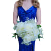 A compact, hand-tied event posy built from large white roses and clustered white hydrangeas-this Simply Elegant Posy reads as timeless and refined for prom or weddings. The mostly white palette with touches of airy baby's breath and deep green foliage creates a soft, luminous look that makes the person you're honoring feel seen and comforted.