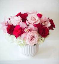 A dreamy mix of soft blush and vibrant pink blooms designed to sweep them off their feet. Blushing Romance features premium roses, ranunculus, and delicate lisianthus nestled into a lush base of hydrangea and seasonal accents. Romantic, feminine, and timeless—this arrangement is perfect for Valentine’s Day, anniversaries, or simply saying “I adore you.”