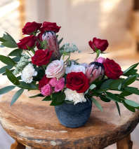 A fun whimsical red rose arrangement perfect for Valentine’s Day. One dozen roses with red mum accents and fresh eucalyptus cut right out of our garden.