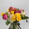This vase arrangement features pink ranunculus, sweetly scented yellow freesia, red pincushion protea, pink and purple tulips, accented with white roses, green hydrangeas and other flowers.