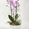 This garden arrangement in a ceramic white vase includes one double stems beautiful pink orchids, along with one succulent and one air plant.