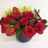 • Features premium red roses, seasonal accent flowers, winter greens, and natural textures