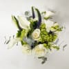 Fresh white roses and white calla lilies are complemented by blue thistle along with purple/pink Veronica flowers, green hydrangea, eucalyptus and other flowers. This lovely vase arrangement is a favorite for many of our customers.