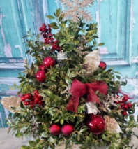 A warm and inviting Home for the Holidays centerpiece that will offer a soft glow to your festive table. Can be made with one or two candles or without. The choice is yours. Standard price is without candles. Deluxe-1 candle, Premium-2 candles.