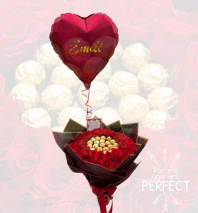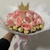 Bouquet of 24 roses with Ferrero chocolates around it and decorated with a small crown.