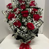 This design consists of a floral foam with a dozen roses and overtime covering a part with Korean paper something different but elegant