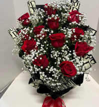 Description: 24 fresh-cut, velvety red roses paired with elegant white accents and lush greens. A timeless choice for anniversaries, birthdays, or "just because." This abundant arrangement comes professionally designed in a reusable glass vase to brighten any room instantly.