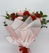 This box contains pink carnations and babys breath that is beautifully arranged around a 7pc box of Ferrero Rocher Fine Assorted Confections. This is the perfect two in one gift to win over the special someone in your life!