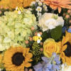 Beautiful fresh loose cut bouquet with BEES and sunflowers, light blue delphinium, peach gerbera daisy, yellow roses, green hydrangea and white roses with accents of peach hypericum berries and white and yellow asters!!! ***NO VASE***
