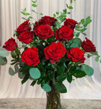 Includes: red roses, red carnations, greens, clear glass vase