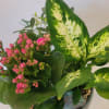 A beautiful blue container with an attached saucer planted with lovely indoor houseplants. It's so pretty I'd place it where it could be seen everyday.
