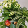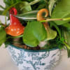 A very pretty ceramic container planted with indoor houseplants. The little ceramic mushrooms are peaking from under the pothos. Ideal gift for anyone.
