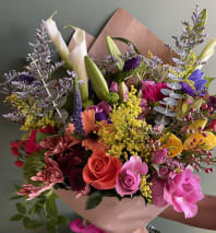 A hand wrap bouquet with peach tones colors….that include roses, chamomile, lilies, gerberas and much more.