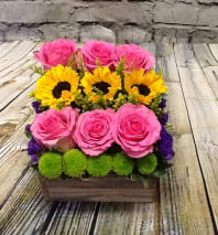 A bright mix of gerbera daisy, sunflowers, roses and hydrangea-this vase is sure to make someone smile.