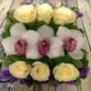 This rustic wooden planter features a pavé design of creamy white roses, green dianthus and cymbidium orchids bordered by purple statice