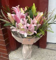 A Wrapped Bouquet of roses, gerbera daisy, tulip, carnations and more! This vibrant bunch in various shades of pink with pops of white is ready to arrive and celebrate any occasion.