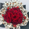 A bold bouquet of lush red roses wrapped in a chic leopard-print accent for a little extra attitude. Finished with a classic red ribbon and sparkling heart details, the perfect mix of romance and edge.