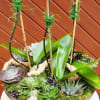 A beauty, featuring a trio of Phalaenopsis orchid plants with spikes showcasing a cascade of large, lovely flowers in blush and long leaves. This breathtaking orchid arrangement is presented in an elegant vase filled verdant moss and succulents for ground cover.