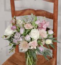 Small designer's choice wrapped bouquet. Colors and flowers will vary depending on availability.