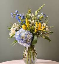This elegant white and blue floral arrangement features fresh white and blue flowers thoughtfully designed for a timeless look. A versatile choice for sympathy flowers, funeral flowers, memorials, or everyday flower delivery, this arrangement symbolizes peace, comfort, and remembrance.