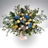 Created in a refined garden style, it features a graceful combination of soft blue hydrangeas, cream roses, delicate delphinium, and lush seasonal greenery. Arranged in a classic pedestal vase, the design offers a full yet airy composition that brings natural elegance and sophistication to any space.