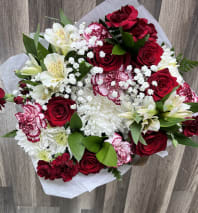 A designers choice mix of colorful blooms, beautifully hand wrapped