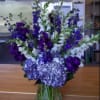This bouquet will be blue + greenery, but may vary in shades and flowers from the bouquet shown. Flowers will be used based upon seasonal availability. Images are for illustration purposes only.