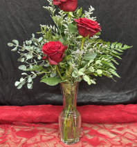 Bold and romantic, this arrangement showcases three stunning red roses, symbolizing love, passion, and commitment. Accented with lush greenery, it's a timeless expression of heartfelt emotions, perfect for any occasion. Greens and filler may vary by availability.
