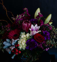 A deep, romantic blend of scarlet blooms—layered with lush greens and textural accents—designed for those who love bold beauty with an edge. This arrangement is moody, modern, and effortlessly unforgettable.