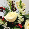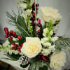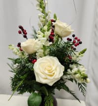 Fresh holiday greens in a red vase compliment this design with white roses, snapdragons, mixed red berries and ting ting to make anyone smile this holiday season. Fresh greens mix is very fragrant and brings the beautiful scent of the holidays into any home.
