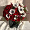 This unique lady vase features a striking "hairstyle" of vibrant red flowers paired with elegant white anemones. The bold red blooms add a touch of drama, while the delicate white anemones bring softness and contrast.