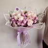 Indulge in the soft beauty of this pastel masterpiece, featuring blush pink roses paired with delicate lavender chrysanthemums and textured pink hydrangeas. Accented with lush greenery and wrapped in elegant pastel pink packaging, this bouquet is tied with a matching satin ribbon for a polished finish. Perfect for birthdays, anniversaries, or expressing heartfelt sentiments.