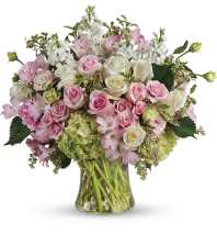 A timeless expression of elegance and peace, Pure Grace features crisp white roses, lilies, hydrangea, and stock accented with soft green textures and lush tropical foliage. Arranged in a low glass cylinder wrapped with fresh greenery, this design brings calm and sophistication to any setting. Perfect for moments of sympathy, celebration, or simply elevating a space with refined beauty.