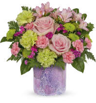 Straight out of a storybook, this whimsical bouquet of creamy blooms is artfully arranged in a stunning stained glass keepsake pot. This unique bouquet features \roses, carnations, alstroemeria, and seasonal greenery. Delivered in Teleflora's Marvelous Mosaic Cylinder. Approximately 14 1/2" W x 12 3/4" H