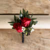 Our classic boutonniere features cluster of flowers worn on a dress or lapel. White florals with accents of greenery is the most popular choice. We'll chose either roses or ranunculus as the focal point floral as we'll found these hold up the best for extended periods of time.