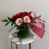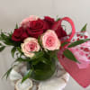 A short and modern styled arrangement of red and pink roses. The perfect Anniversary or Valentine's Day addition.