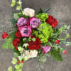 A lush blend of lavender roses, rich red carnations, green hydrangea, blush spray roses, white Larkspur and delicate filler blooms, thoughtfully arranged in a glass vase with fresh greens. Bold yet balanced, this design is perfect for birthdays, anniversaries, or sending something beautiful “just because.”