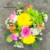 Bright, cheerful, and full of life, Sunlit Love is designed to celebrate the warmth of Mom. This vibrant arrangement features sunny yellow chrysanthemums surrounded by lush green shamrock hydrangea, soft pink roses, and playful orange spray roses and carnations. Delicate waxflower and fresh greenery add texture and movement, creating a joyful garden-style design.