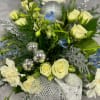 Bring a touch of icy serenity to the season with Winter Sky, a cool-toned holiday arrangement filled with soft ivory roses, white carnations, blue delphinium, and winter greenery. Sparkling silver ornaments, frosted accents, and a snowflake ribbon add a shimmering finish that captures the quiet beauty of a winter morning.